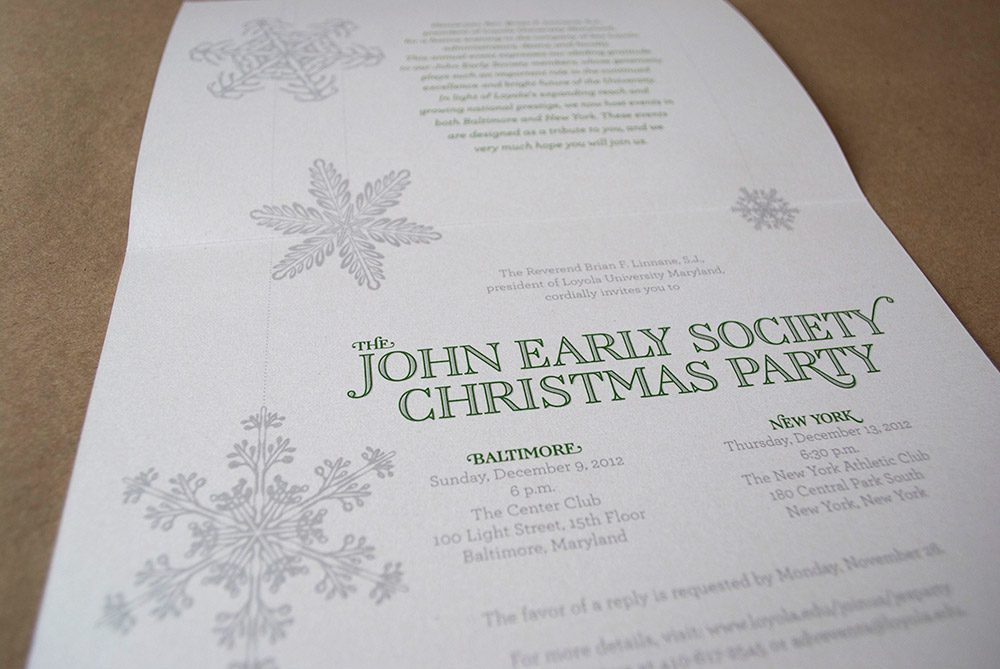The John Early Society is Loyola’s leadership annual giving society for donors to the University. Each year, a Christmas celebration is held to thank donors for their contributions to and involvement with Loyola. For the 2012 soirée, the event planner was seeking an invitation package that would evoke the elegance of the venue and the festivity of the season. I chose a simple palate of green and silver (variations of Loyola's school colors - green and gray), and added depth with tactile details such as pearlized paper and silver foil snowflakes.